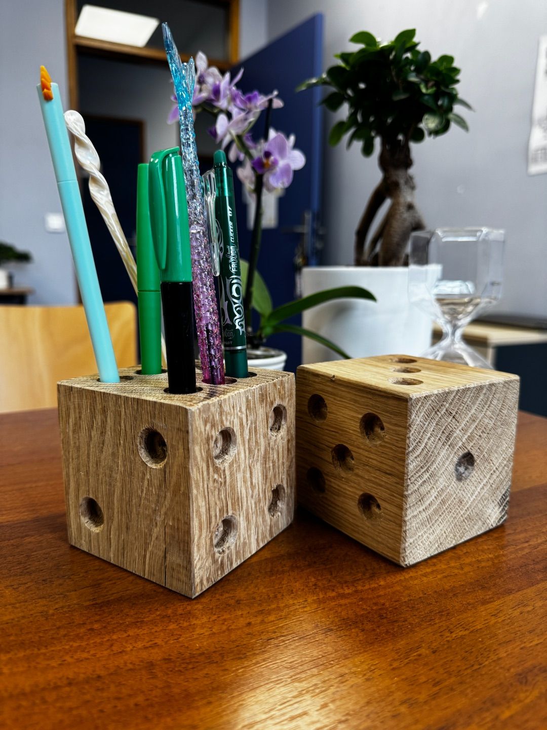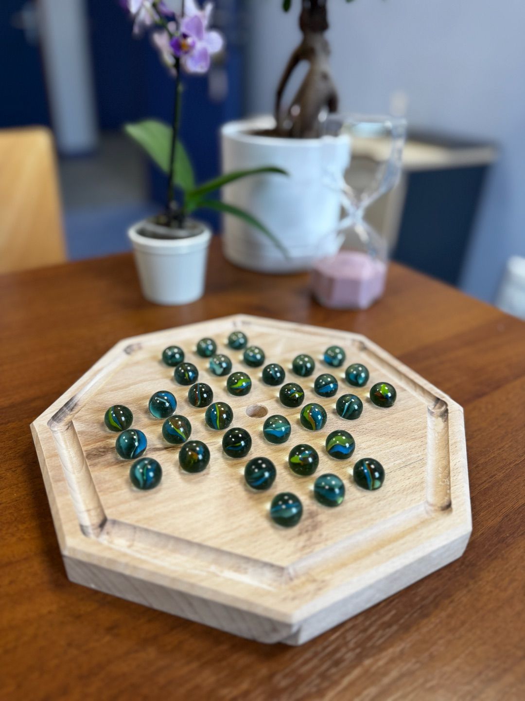 Les objets confectionnés d'un peu plus près, avec dans l'ordre : le dé, le dessous de plat puis le solitaire.