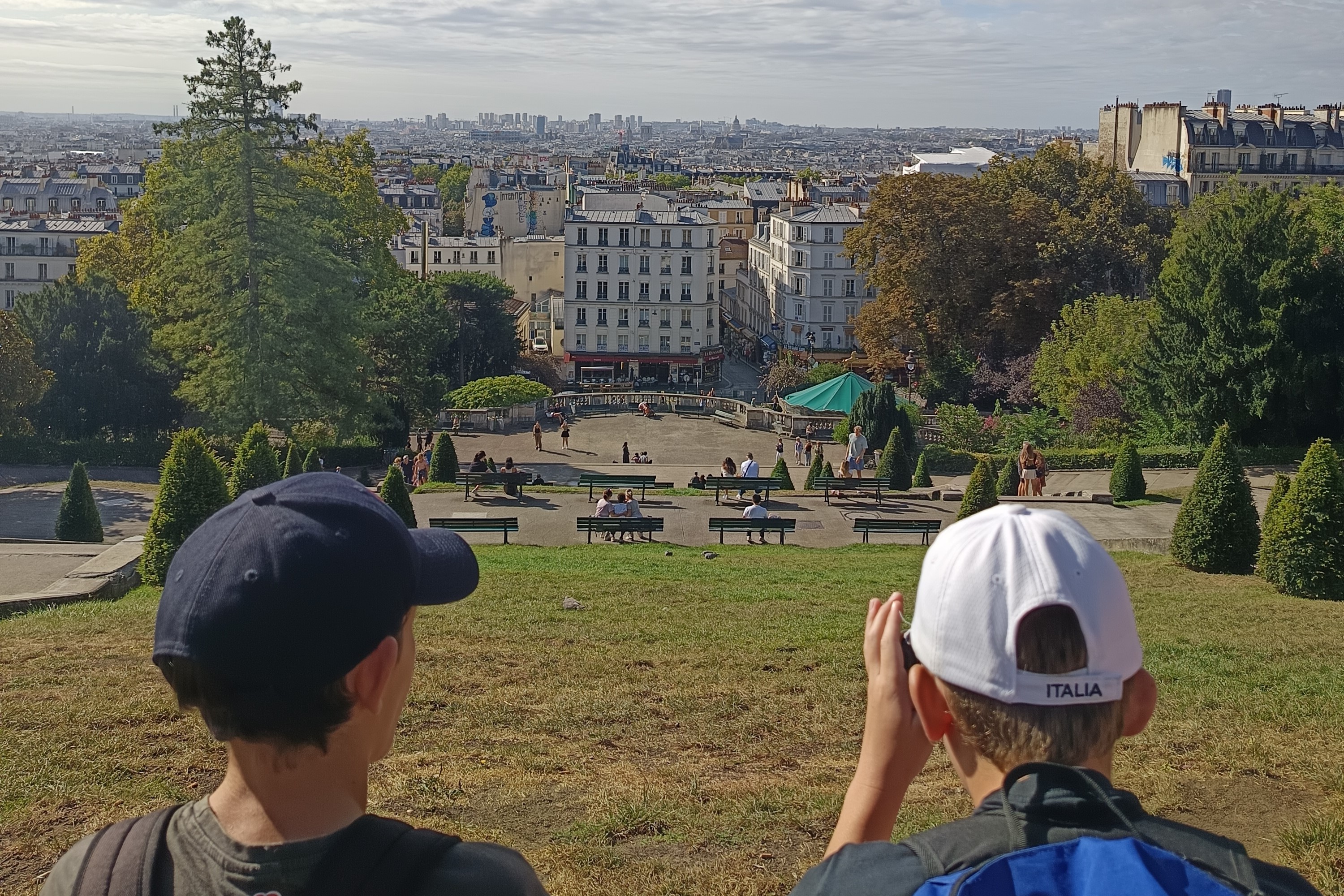 À midi : pause-déjeuner ! Le groupe s’est installé au parc de la Turlure, à deux pas et pourtant si calme, loin du tumulte de Montmartre. Les élèves sont restés plus d’une heure à jouer à la balle, à papoter, ou à écouter quelques explications sur la noblesse du pigeon, animal mal-aimé, souvent comparé à un rat volant, mais pourtant utile, intelligent et succulent. Le parc de la Turlure offre également des jeux pour enfants sur lesquels les élèves auraient pu passer la journée (à courir, grimper, s’arroser aussi) s’il n’avait pas fallu siffler la fin de la récréation.