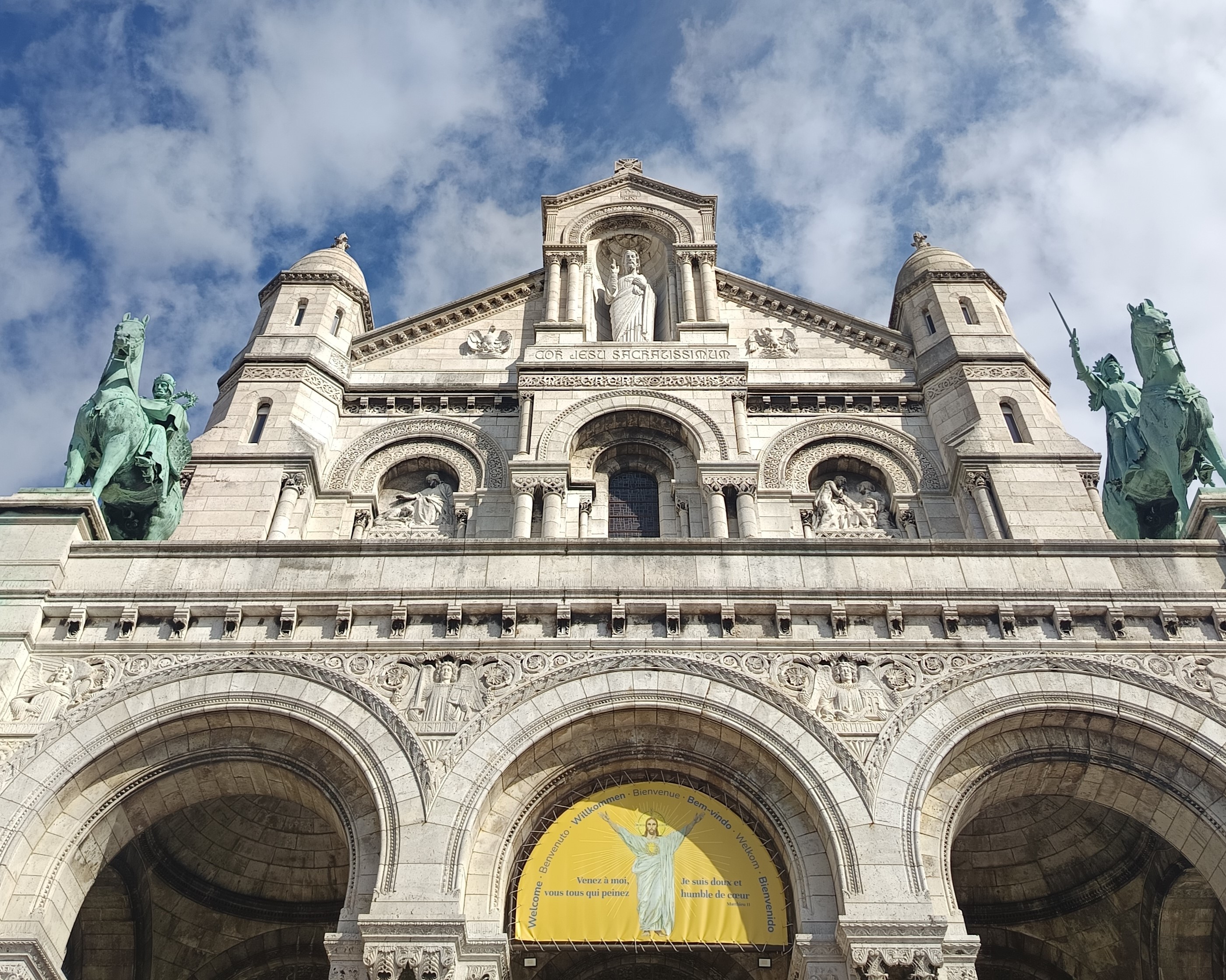 Arrivés à la station Anvers après avoir emprunté le RER B puis le métro, nous avons remonté la rue de Steinkerque puis gravi les escaliers du square Louise-Michel. Devant l’incroyable panorama que l’on peut admirer depuis le haut de la Butte Montmartre, quelques explications ont été données sur la basilique devant laquelle nous nous trouvions : le Sacré-Cœur. L’occasion d’évoquer le programme de sixième sur les Grands Textes fondateurs, de présenter certains symboles et personnages de la religion chrétienne (la croix, Jésus, Marie, l’ange Gabriel) et d’expliquer leur place dans les autres religions abrahamiques (le judaïsme et l’islam), ainsi que de dire quelques mots sur l’architecture du lieu.