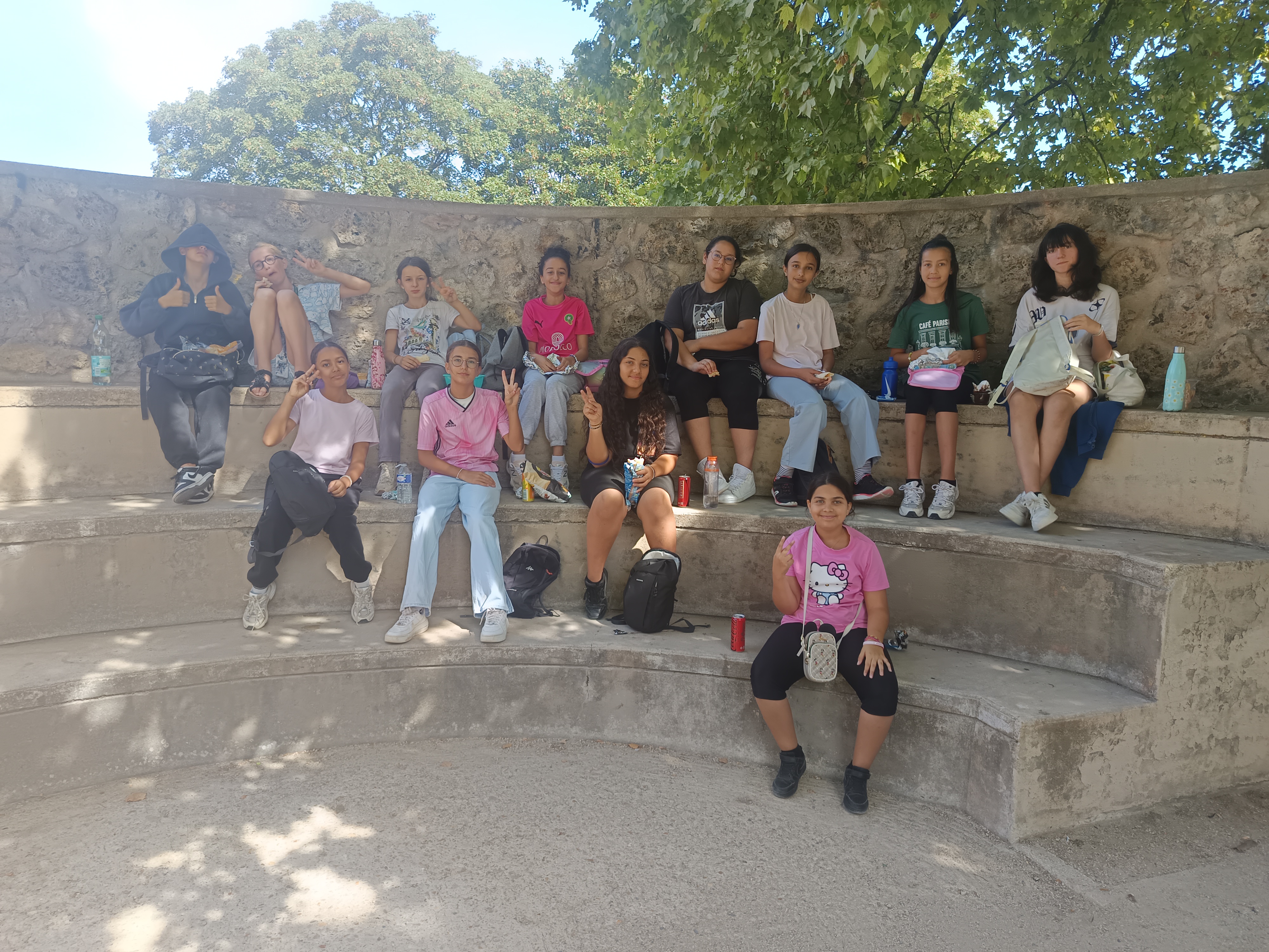 La balade s’est poursuivie vers le jardin Louise-Weber ; sur le chemin, le groupe s’est arrêté quelques instants devant l’ancienne maison de Dalida, puis sur la belle place Émile-Goudeau. Au jardin Louise-Weber, une dernière session d’activités sportives a eu lieu : tandis que la plupart des élèves grimpaient sur le faux bateau en bois, une équipe de football improvisée (Kamron, Evan, Jonas et M. Laouedj) affrontait les joueurs locaux… et les battait (5–3) !