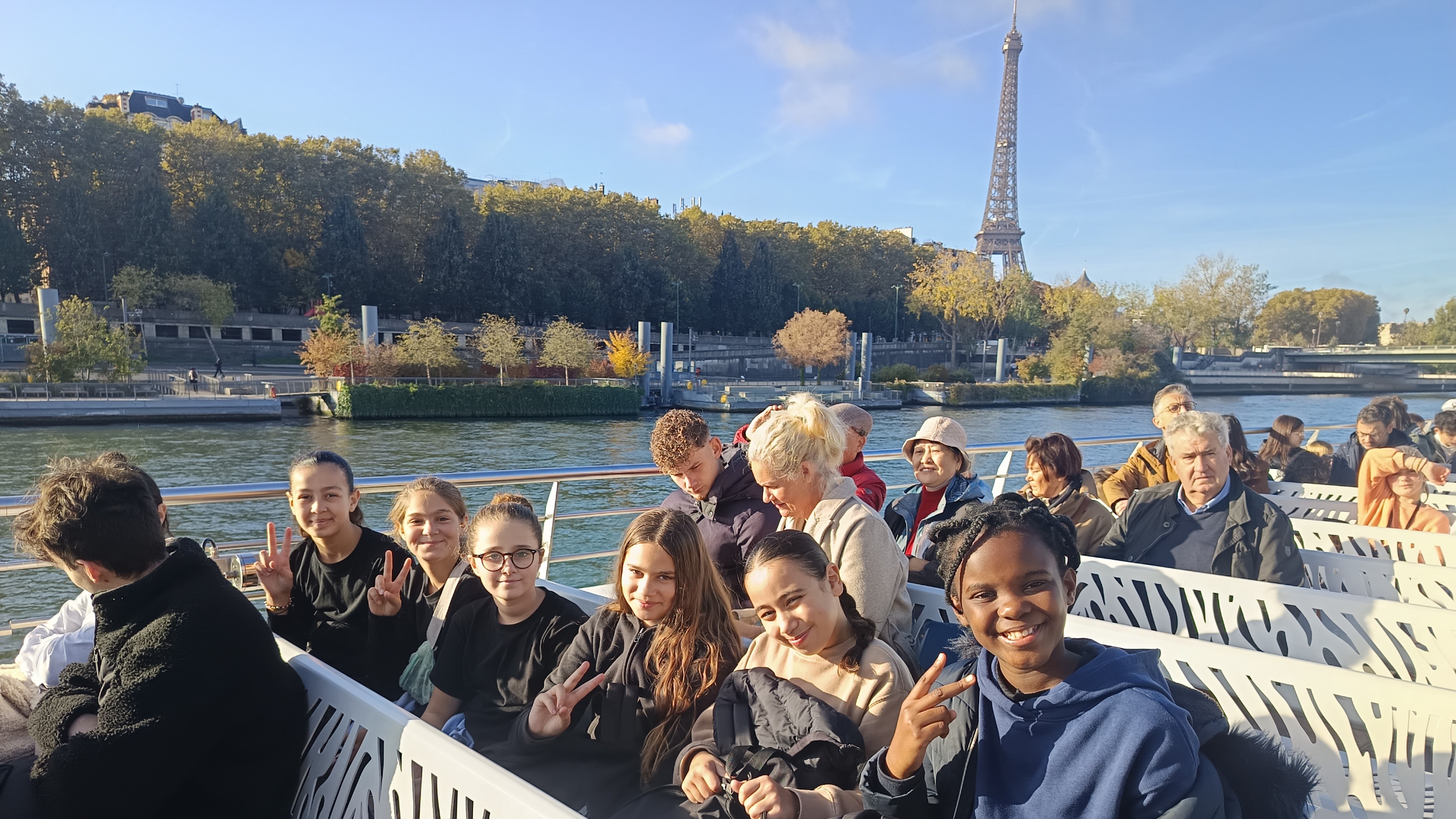 À 10h30, nous embarquions sur les célèbres bateaux-mouches parisiens pour une promenade fluviale de plus d’une heure ! Nous avons ainsi longé, regardant à bâbord et à tribord, la place de la Concorde, les Tuileries, le Louvre, la Monnaie, l’Assemblée nationale, le musée d’Orsay, jusqu’à arriver à l’Île de la Cité puis l’Île Saint-Louis, avant de repartir en sens inverse, dépasser le pont de l’Alma, puis passer devant la Tour Eiffel et les immeubles de la Défense. Une très belle découverte qui a permis aux élèves d’admirer Paris depuis un tout nouveau point de vue, en se laissant porter par la poésie des rives séquaniennes.