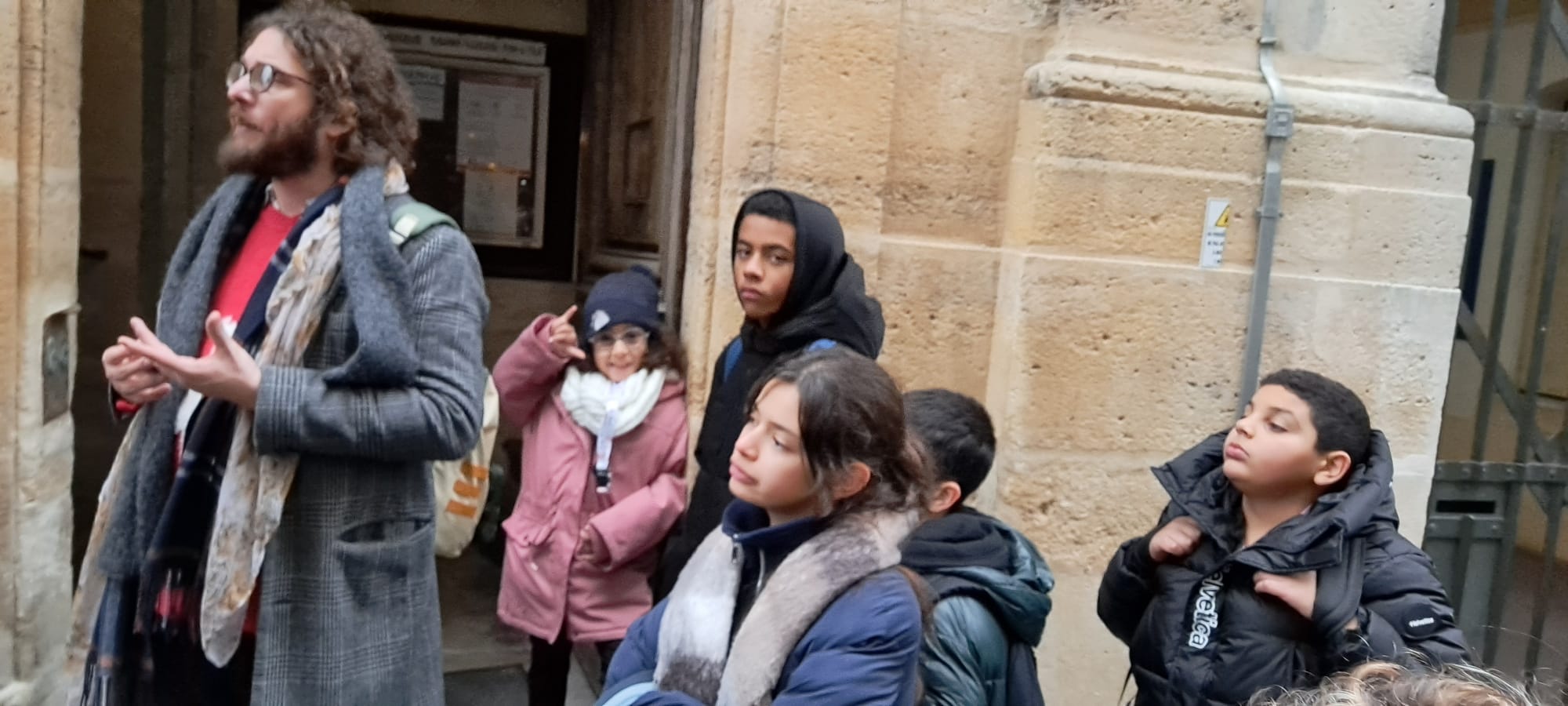 Nous avons d’abord visité Notre-Dame de Paris : l’occasion d’expliquer plusieurs éléments de la religion chrétienne et de faire des liens avec les deux autres monothéismes abrahamiques, le judaïsme et l’islam, conformément aux programmes de français et d’Histoire-géographie des classes de sixième et de cinquième. Dans la cathédrale, nous avons pu observer diverses représentations de personnages importants pour les chrétiens (Jésus-Christ et sa mère Marie, souvent représentée en bleu ; l’ange Gabriel ; Saint-François d’Assise) ; des statues, des rosaces (parmi les plus grandes d’Europe !), et des tableaux, dont un d’une Vierge chinoise peint par l’artiste Yin Chin.