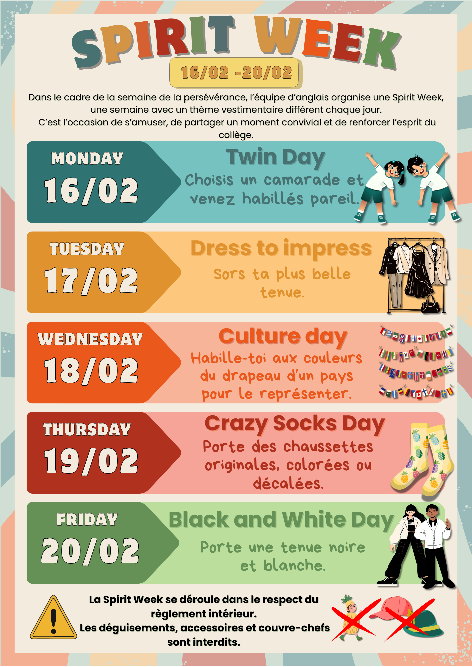 Cette année pour la 1ère fois, les professeures d'anglais ont organisé une SPIRIT WEEK, en collaboration avec la semaine de la persévérance scolaire, du 16/02 au 20/02. Le but ? Engager les élèves dans une démarche collective en proposant des journées à thème pendant une semaine. Voici le programme initial et les photos souvenirs des élèves et adultes, venus en nombre pour cette première édition.